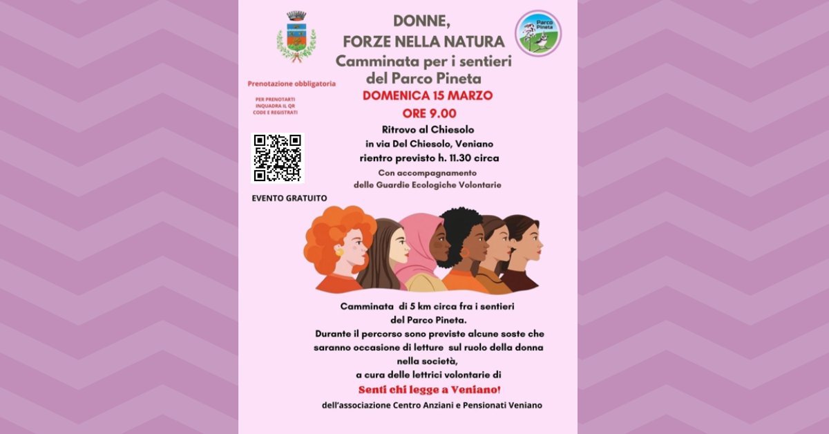 Camminata di 5 km circa fra i sentieri del Parco Pineta. Durante il percorso sono previste alcune soste che saranno occasione di letture sul ruolo della donna nella società, a cura delle lettrici volontarie di “Senti chi legge a Veniano!” dell’Associazione Centro Anziani e pensionati Veniano.