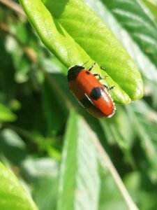 La crisomela del pioppo, di forma ovale, poco più lunga di un centimetro e con le elitre rosse senza puntini. Si nutre di foglie di pioppo, a cui può provocare ingenti danni.