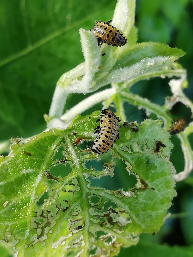 La dorifera della patata (Leptinotarsa decemlineata), di forma ovale, lunga circa un centimetro e dalle elitre a strisce crema e nere. Si nutre di foglie di patata o melanzana, causando molti danni.