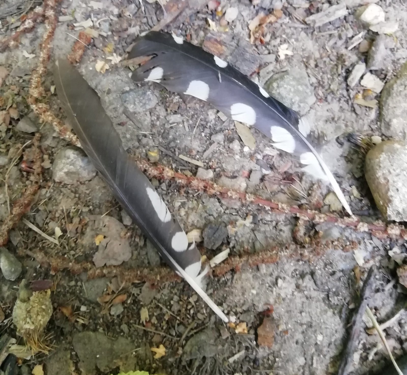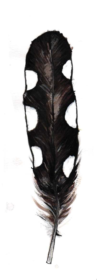 Può capitare di trovare una delle penne delle ali nel bosco. E’ facile da riconoscere: nera con mezzi pois bianchi.