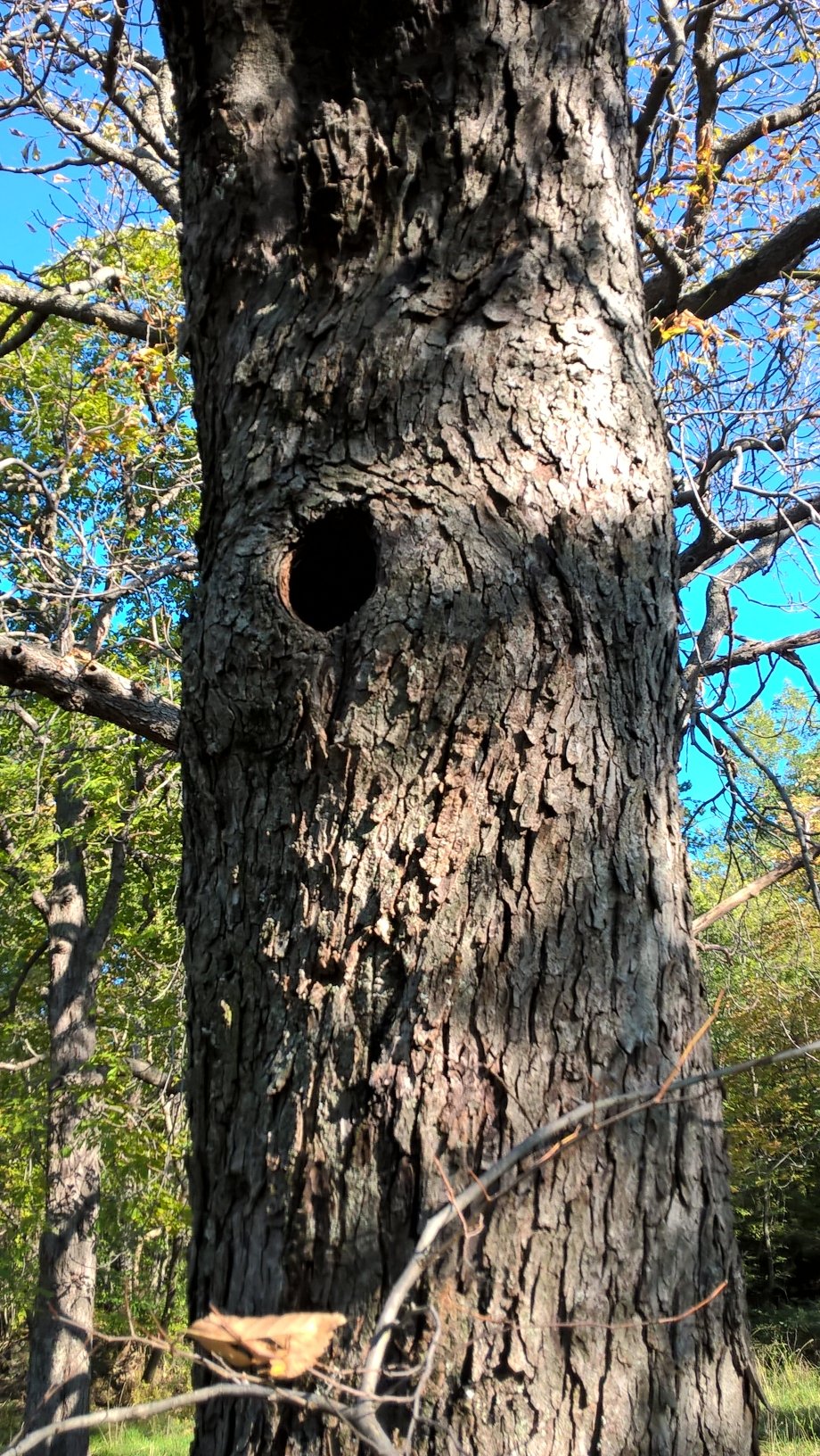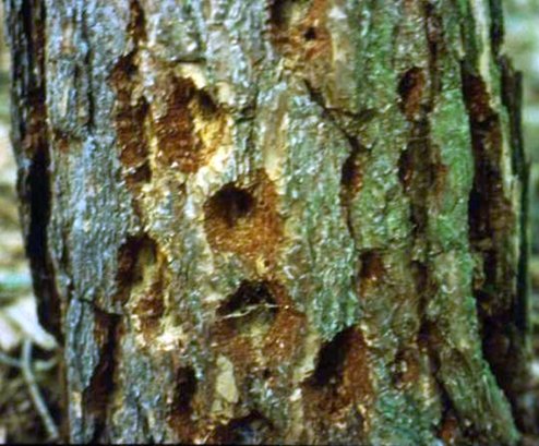 Un altra traccia che si può osservare nel bosco è un albero morto con buchi dai margini irregolari. Il picchio fora la corteccia col becco fino a raggiungere una galleria scavata da un insetto, quindi vi introduce la lingua per catturarlo.