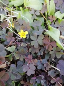 Simile ad un piccolo trifoglio, la foglia è composta da 3 foglioline a forma di cuore. Il colore è spesso scuro per la presenza di sfumature viola.