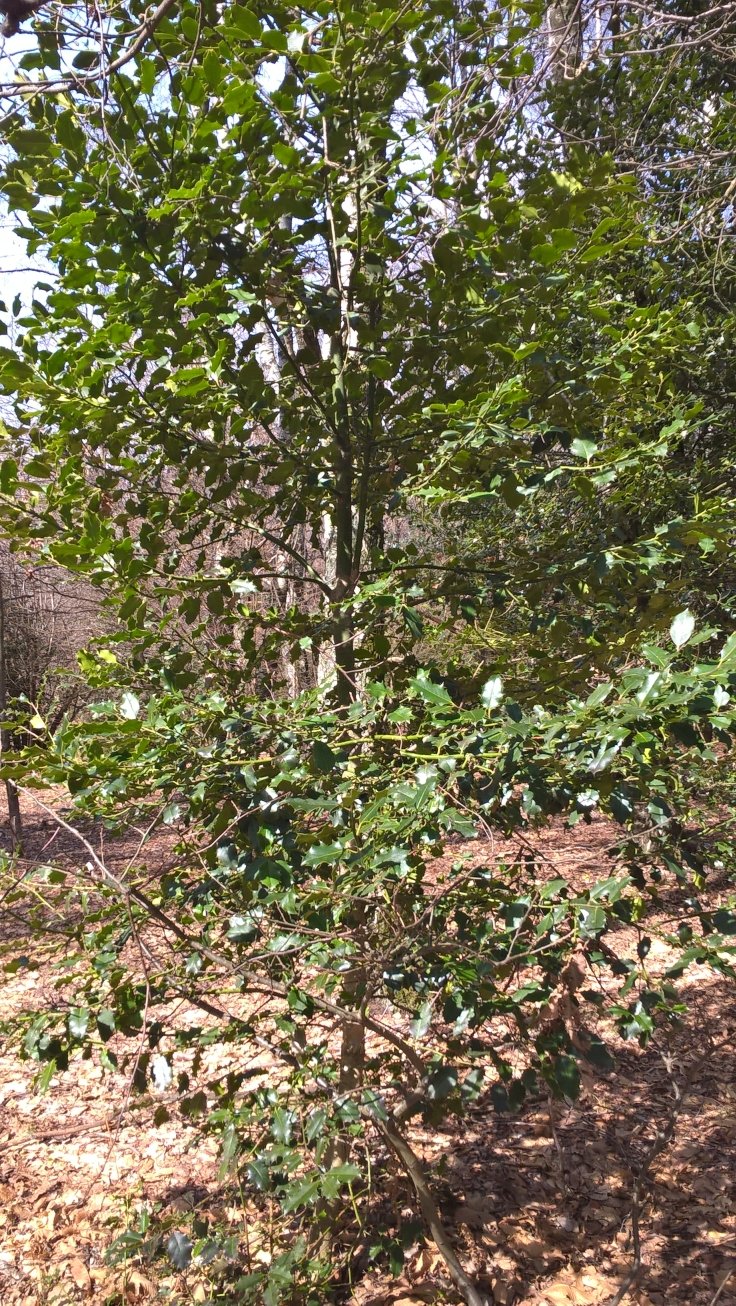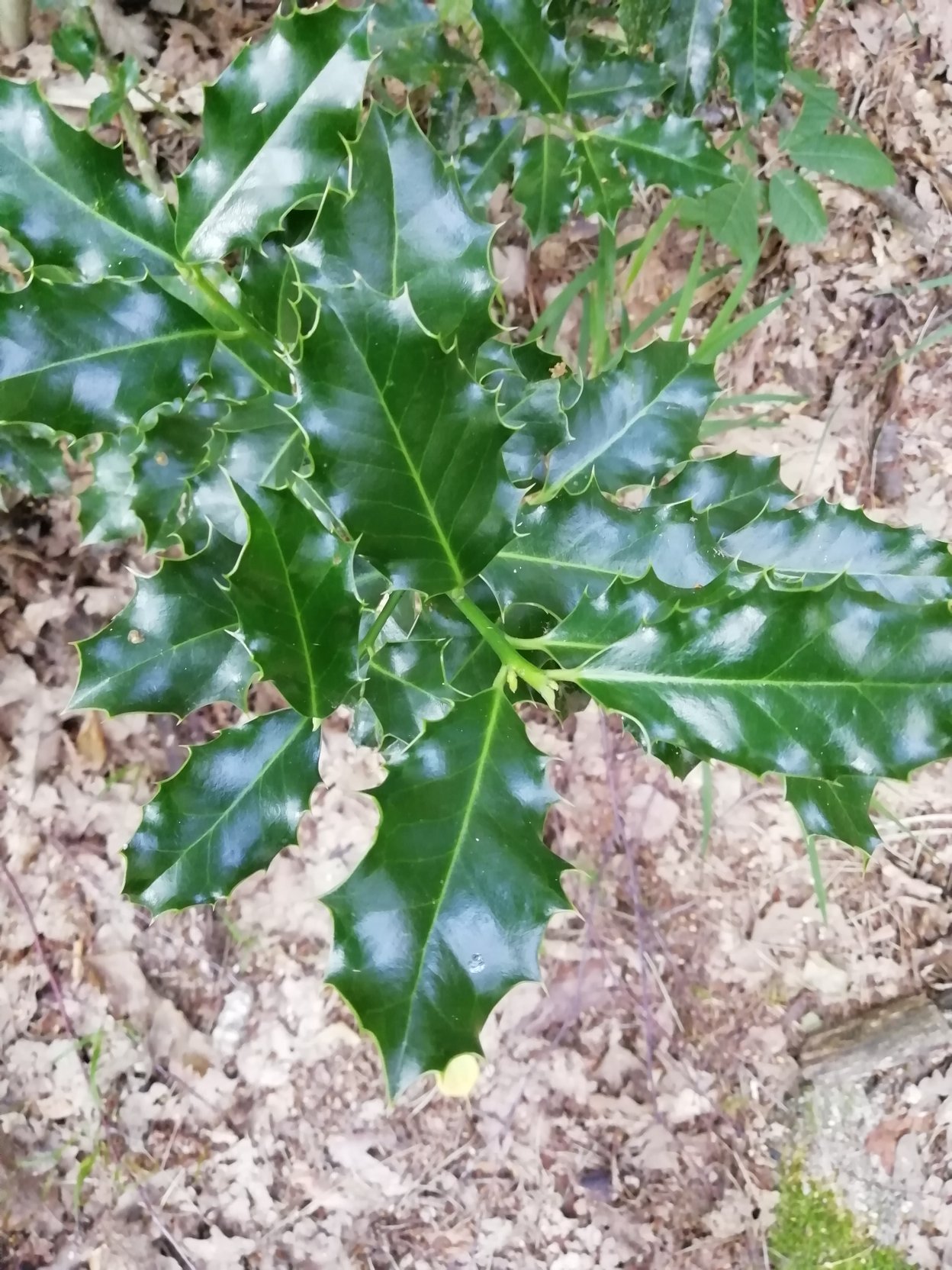 La foglia è ovata, dal margine ondulato e con punte spinose. E' sempreverde e al tatto è consistente, coriacea. Le foglie dei rami superiori non hanno spine sui lati.