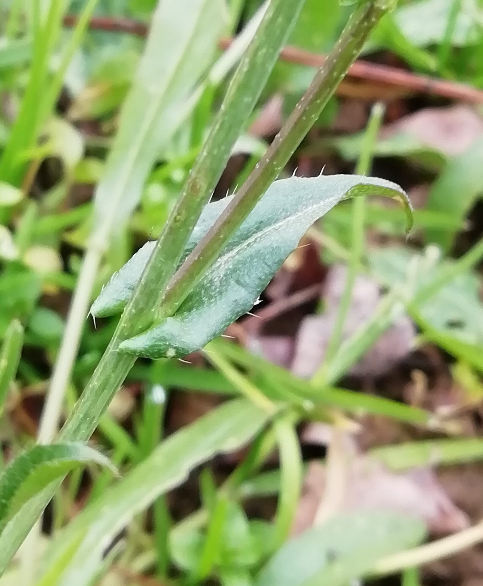 Le foglie basali sono riunite in una rosetta e hanno un breve picciolo. Sono lanceolato-lobate, dentate o intere. Le cauline non hanno picciolo, hanno forma sagittata e abbracciano il fusto