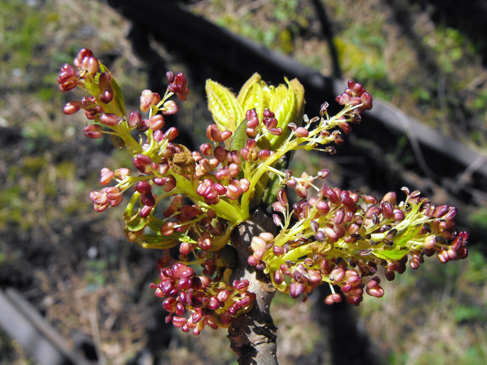 I fiori sono piccoli, di colore verdastro e compaiono prima delle foglie. Sono riuniti in infiorescenze a pannocchia.