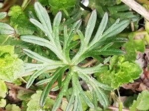 Le foglie hanno forma circolare, ma sono divise in segmenti molto stretti. Sono pelose.