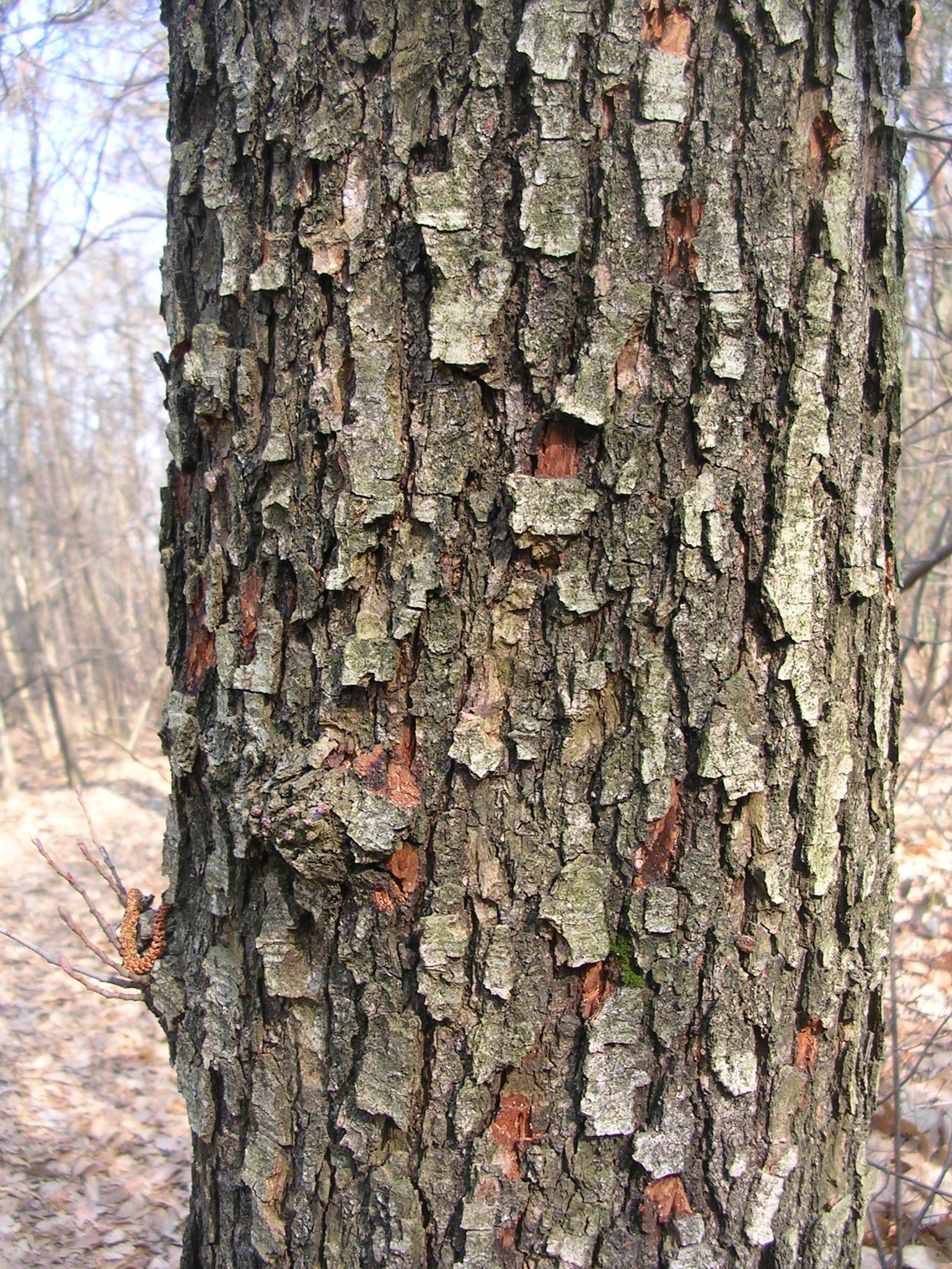 La corteccia è verde grigia con lenticelle nell’individuo giovane, poi grigiastra e fessurata in piccole placche.