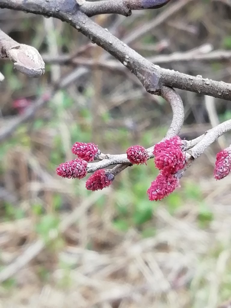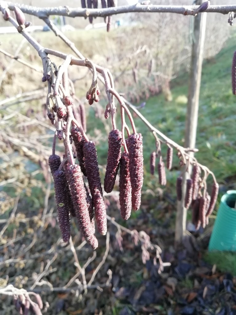 In primavera si notano gli amenti (infiorescenze maschili) lunghi fino a 12 cm e rosso violacei quando sono ancora chiusi.