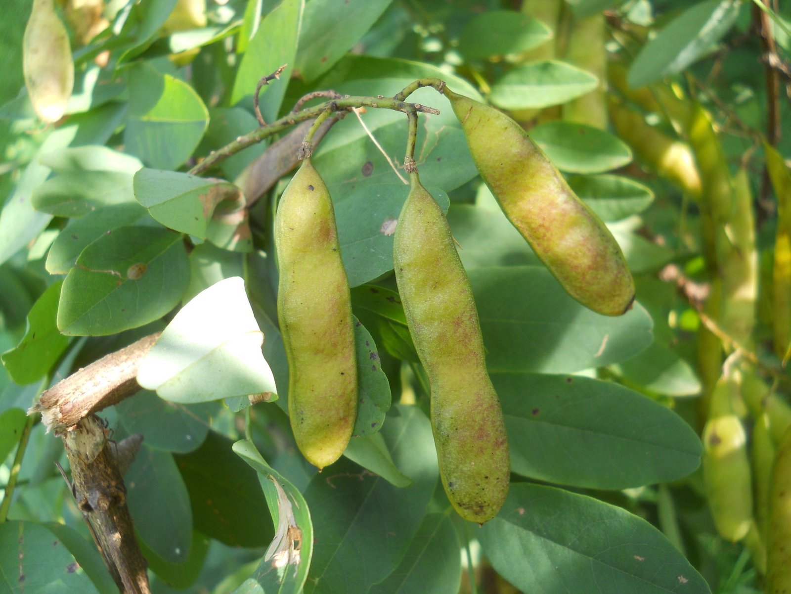 Baccelli, simili a quelli dei fagioli (è una leguminosa) ma più piatti e lunghi una decina di centimetri. Prima verdi, poi bruno-neri.