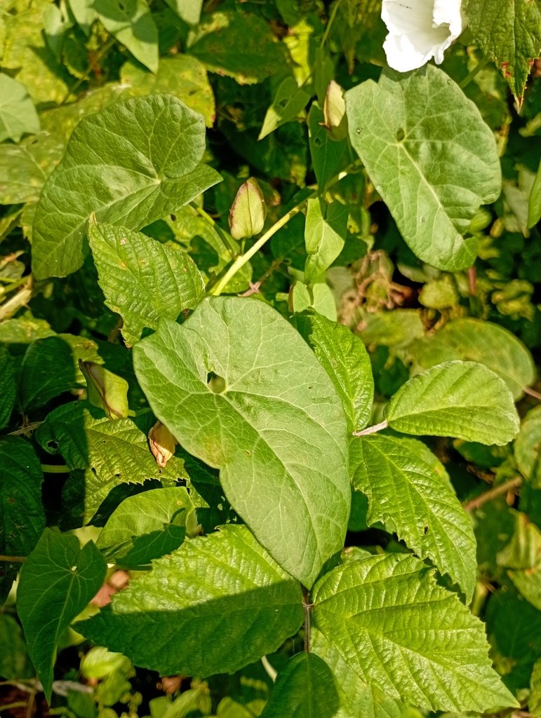 La foglia è sagittata, lunga fino a 10 cm e con un lungo picciolo.