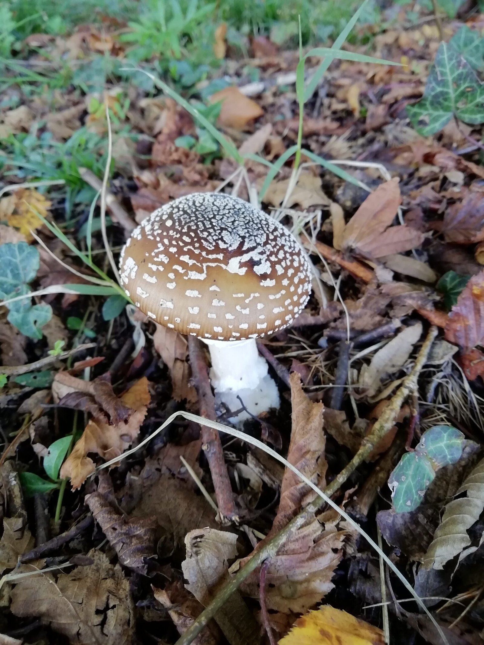 L’Amanita pantherina è un fungo dal cappello bruno-castano cosparso di verruche bianche e il bordo striato.