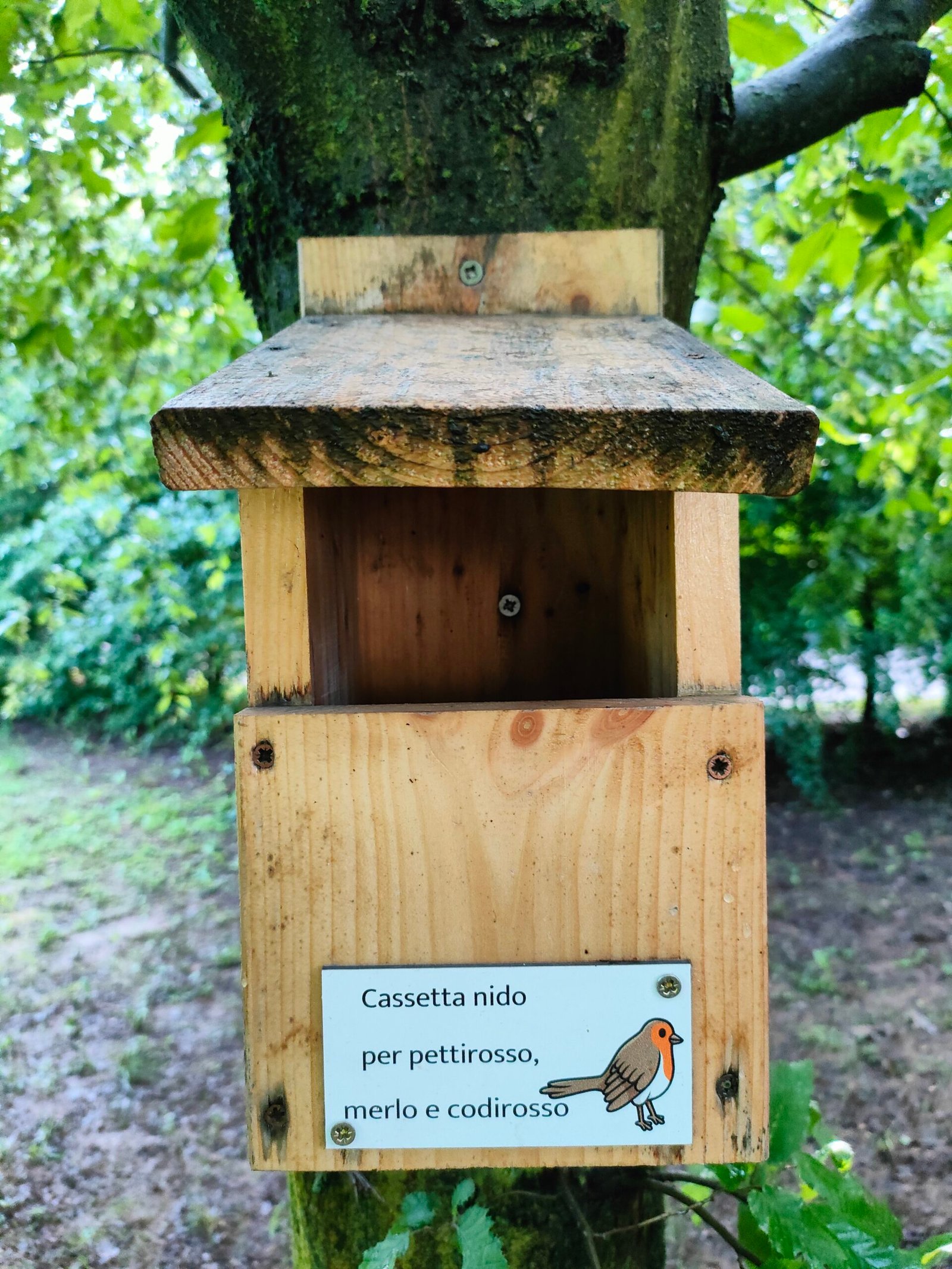 Pettirosso, scricciolo, codirosso e merlo possono sostare a turno in una cassetta nido aperta (come nella foto), mentre le cince ne hanno una tutta per loro. Ci sono poi rifugi per ricci, rettili, pipistrelli e insetti. È stata delimitata una piccola area in cui lo sfalcio dell’erba viene fatto solo una volta all’anno per favorire l’importante compito degli insetti impollinatori.