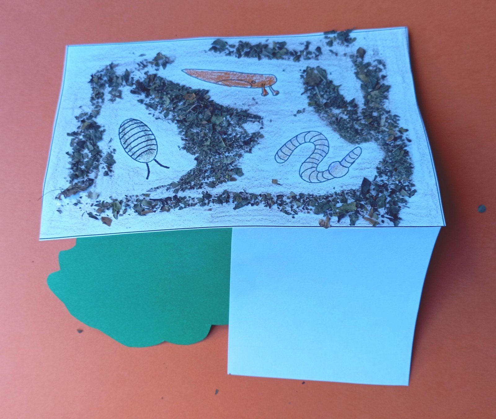 Sopra si vede il prato, un cespuglio, un muretto con una lucertola. Ribaltando il diorama, vediamo cosa c’è sotto: lombrichi, porcellini di terra, lumachine in rappresentanza degli animaletti che vivono nel suolo.