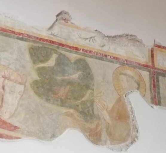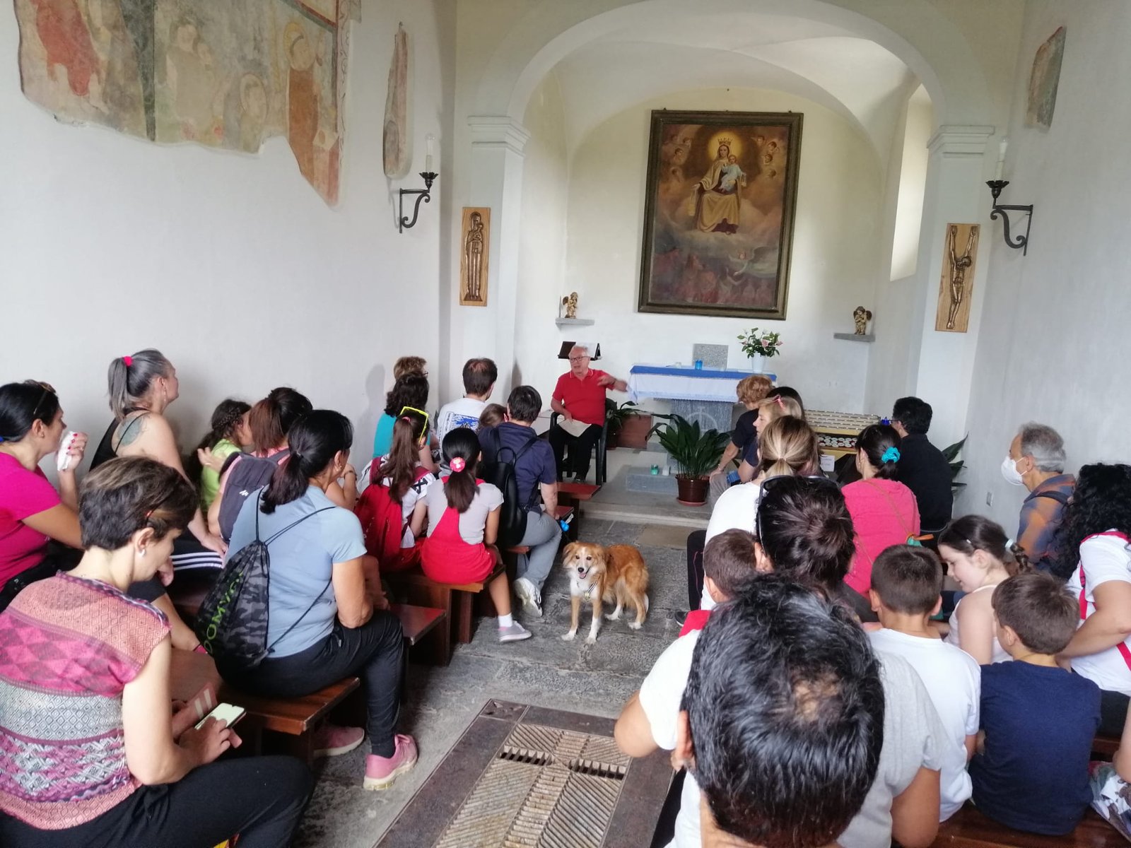 Si è poi raggiunta l’antica chiesa di Santa Maria di Veniano. Grazie a Dante, volontario della inviatoci dalla parrocchia, abbiamo imparato un po’ la storia di questa caratteristica chiesetta. Terminata di costruirsi nel 1300 circa, vi sono sepolti i preti e le persone fin dal 1200. E’ il primo cimitero di Veniano. Le pareti interne riportano gli affreschi eseguiti da viandanti che in quegli anni passavano di lì e si fermavano per ristorarsi. Particolare è l’affresco che ritrae San Francesco predicare agli uccelli : a neanche un secolo dalla sua morte è bello che l’autore abbia voluto ritrarre il Santo in quella posa proprio all’ingresso del sentiero che ora noi chiamiamo delle Uccellande.