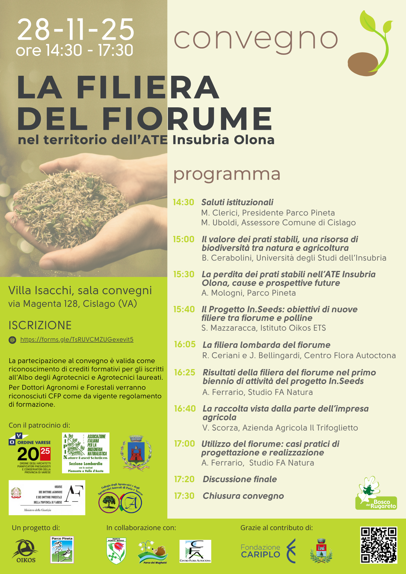 Il 28 novembre 2025, dalle 14:30 alle 17:30, presso Villa Isacchi (via Magenta 128, Cislago – VA) si terrà il convegno “La filiera del fiorume”, un’occasione di confronto sul valore dei prati stabili e sul ruolo del fiorume nella tutela della biodiversità e nella promozione di pratiche agricole sostenibili.
