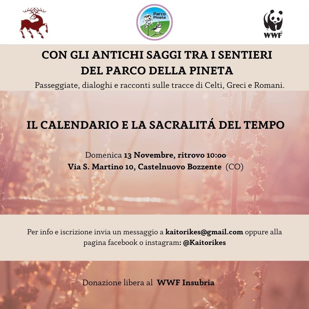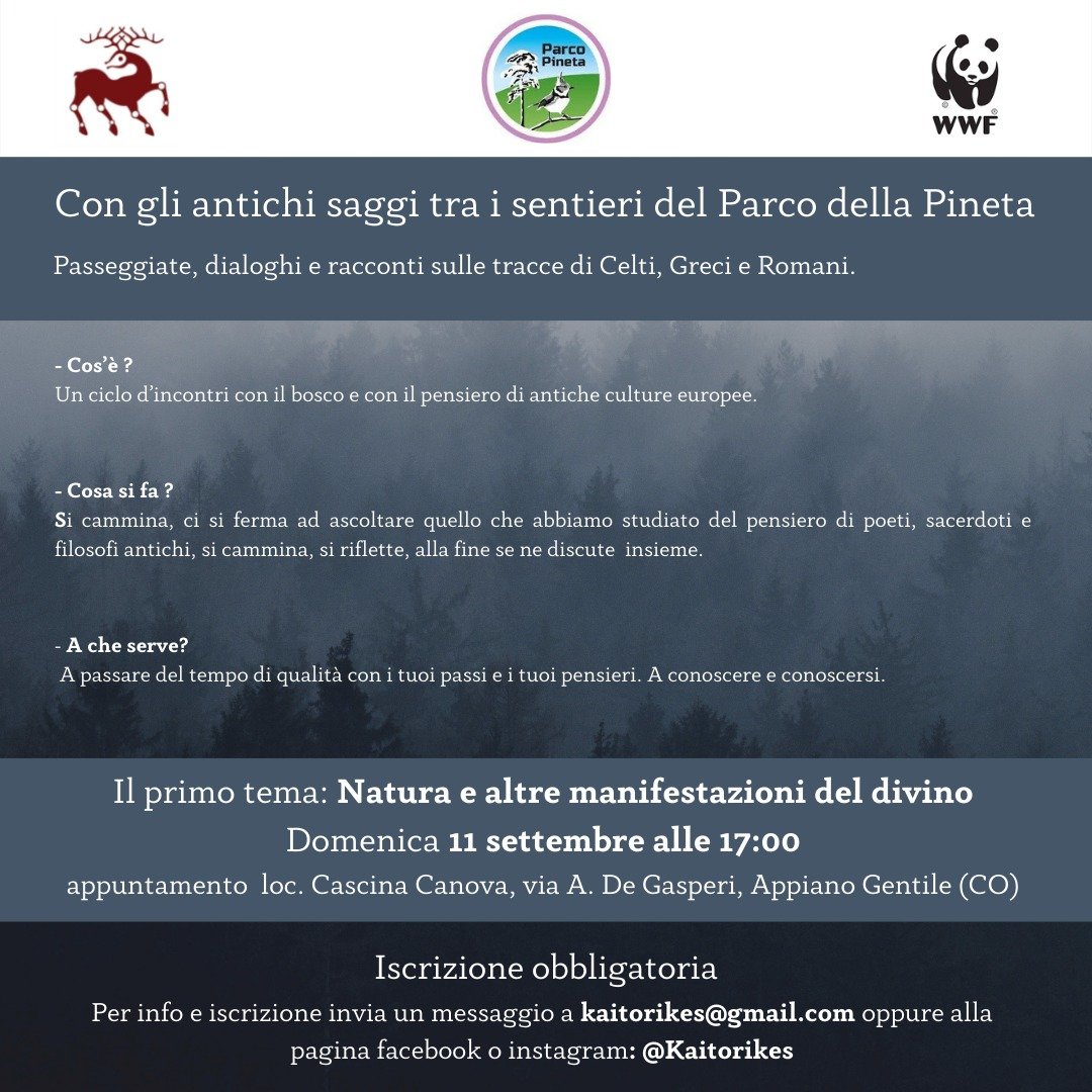 Le associazioni WWF Varese – Insubria e Kaitorikes si propongono semplicemente di scambiare piccoli pezzi di saggezza antica camminando tra i boschi del Parco della Pineta. Dialoghi in movimento, riflessioni dinamiche: ma per costruire un dialogo ci vuole une tema. I nostri dialoghi avranno come tema conduttore il punto di vista delle antiche civiltà europee nelle loro diverse fome: celtica, greca e romana.