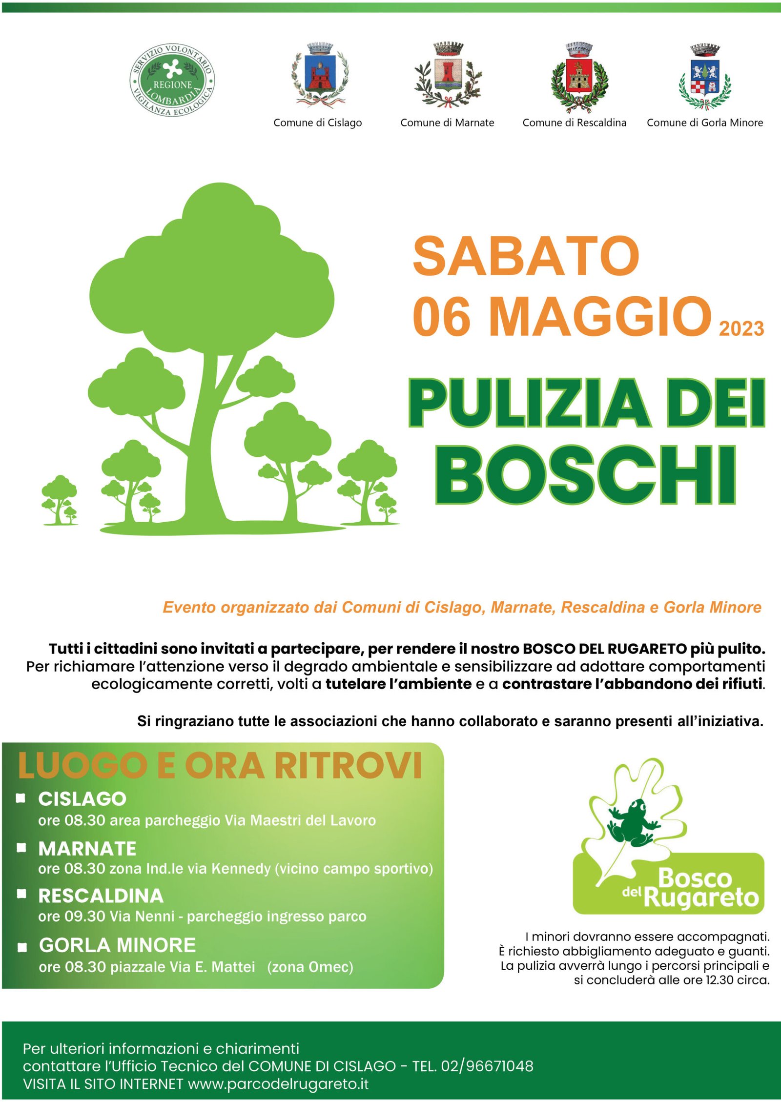 I comuni di Cislago, Marnate, Rescaldina e Gorla Minore organizzano per la giornata del 6 maggio una giornata di pulizia dei boschi. Tutti i cittadini sono invitati a partecipare, per rendere il nostro BOSCO DEL RUGARETO più pulito, per richiamare l’attenzione verso il degrado ambientale e sensibilizzare ad adottare comportamenti ecologicamente corretti, volti a tutelare […]