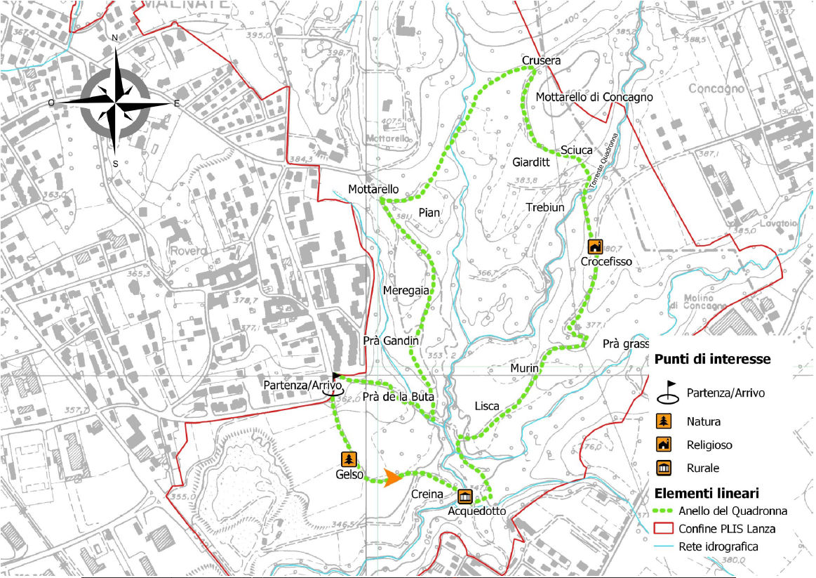 Il percorso parte dalla frazione Rovera di Malnate in Via Settembrini ove si segue, non appena inizia la salita, la pista ciclopedonale sulla destra che porta alla frazione San Salvatore. Dopo un centinaio di metri si incontra sulla destra un vecchio albero di gelso, retaggio delle passate coltivazioni del baco da seta. Alla bacheca del Parco in zona Creina si oltrepassa con un ponticello il torrente Quadronna e si inizia la salita. Poco dopo seguendo le indicazioni si devia a sinistra e, dopo aver incontrato il sentiero 512 della Gran Fondo dei Longobardi si supererà con un piccolo guado un ruscello chiamato Rio Freddo per la temperatura sempre fresca delle sue acque. Il guado normalmente non presenta difficoltà ma, in caso di forti piogge può risultare particolarmente ostico. Si risale la comoda stradina sterrata fino ai prati della Lisca e del Murin e quindi al bivio del Crocefisso. Da qui si scende per superare nuovamente con un piccolo ponte il torrente in zona Sciuca. Si sale fino alla località Mottarello di Concagno e, attraversando larghi boschi di castagno si incrocia in località “Crusera” il sentiero 513 Cima delle Valli.