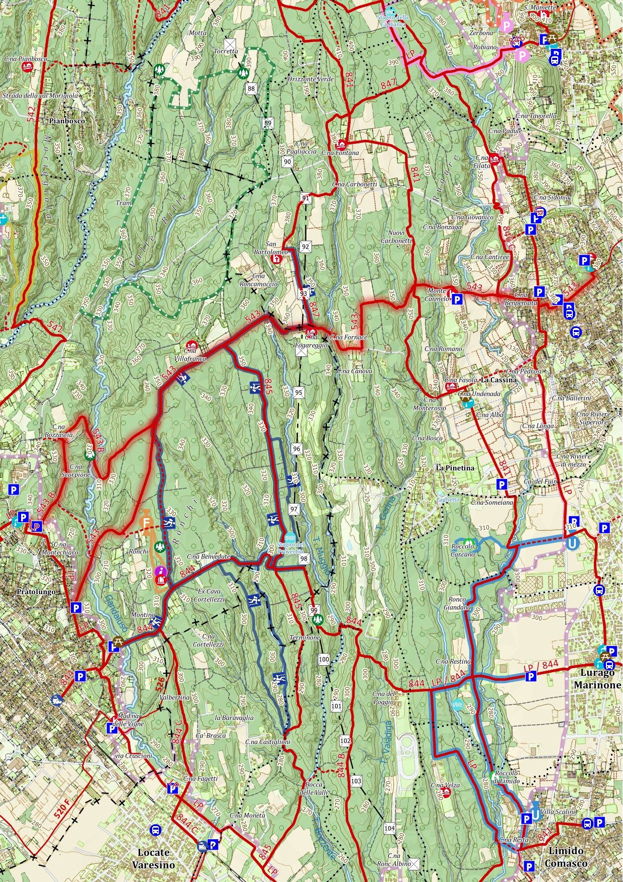 Il sentiero 543 inizia dal parco di Villa Rosnati, sede del municipio, nel centro storico di Appiano Gentile, e attraversa la parte centrale del Parco, da est a ovest, giungendo a Tradate in via Mayer, collegandosi al sentiero LungoParco.